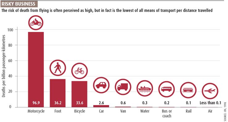 Ellen Peters, who studies decision-making in health and finance at Decision Research, says the negative feeling associated with cancer can be so strong that presenting people who have drawn such emotional conclusions with a more realistic risk assessment based on probabilities and statistics may have little or no impact on their judgement. That's unless they have a strong understanding of what probabilities mean. "Health is driven by emotions, anxiety and trust in your doctor. Few want to see the evidence, just as most people do not know how much safer flying is than driving and do not make attempts to find out," says Gigerenzer. According to Michael Sivak and Michael Flannagan of the University of Michigan at Ann Arbor, driving the length of a typical domestic flight in the US (estimated at 1157 kilometres) is 65 times riskier than flying. The events of 9/11 would have to occur every month before flying became as risky as driving (American Scientist, vol 91, p 6).