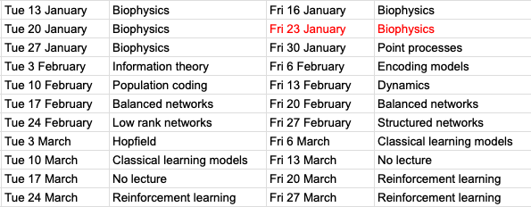 Place: Gatsby Unit Seminar Room on 23 Jan; SWC Ground Floor Lecture Theatre on all other dates